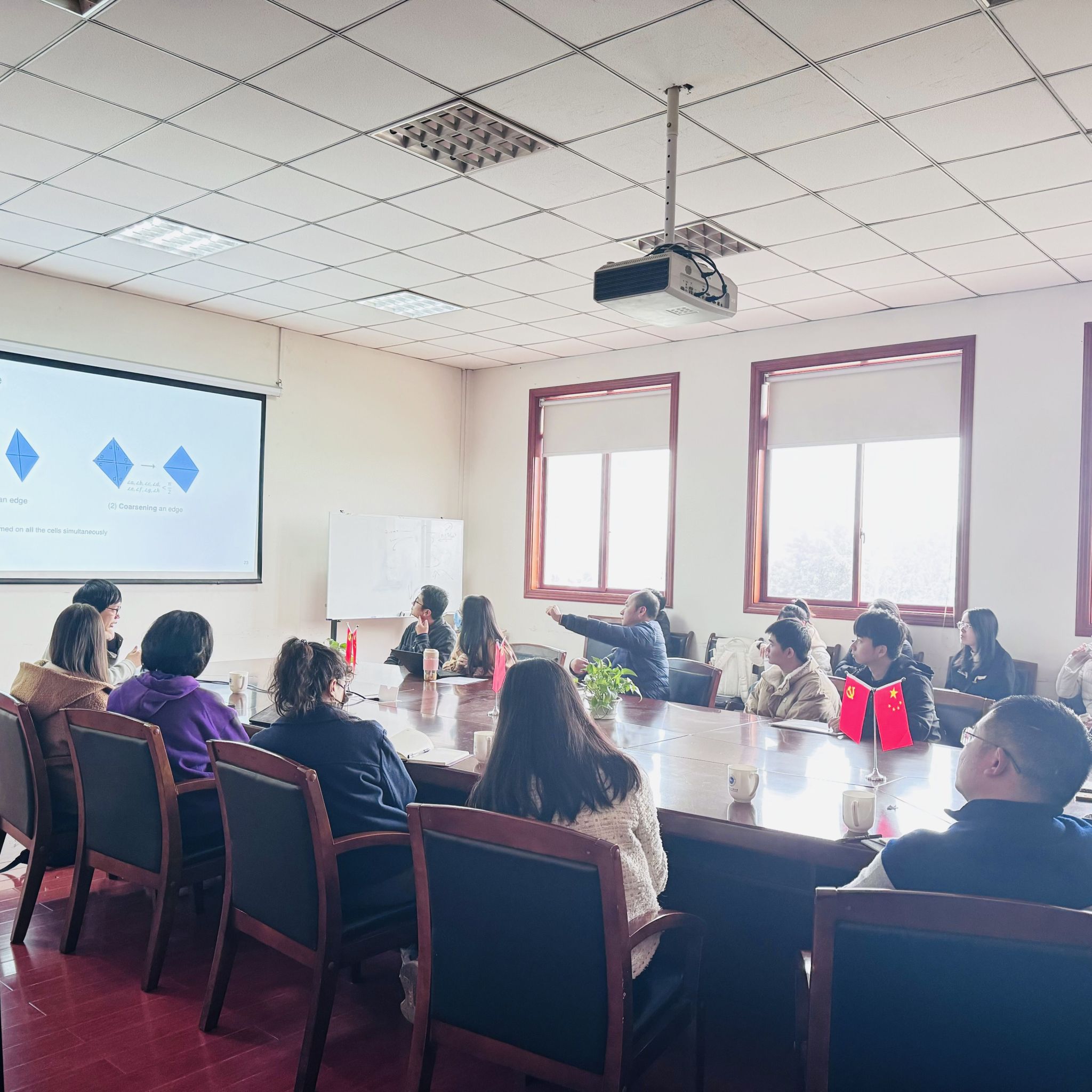 吴泰霖研究员从AI用于物理仿真和设计,介绍了当前机器学习所面临的挑战以及在大气科学领域的应用,包含多分辨率、复杂的边界条件等方面,并给出了相应的解决方案,用多个图神经网络分别学习系统演化和优化网络、同时学习物理以及优化目标等进行了口头报告。会后,张宇院长、樊晋副教授、杨显玉副教授和吴小飞副教授与吴泰霖研究员就机器学习在高分辨率的天气预报模式等领域热点问题进行了深入的探讨。