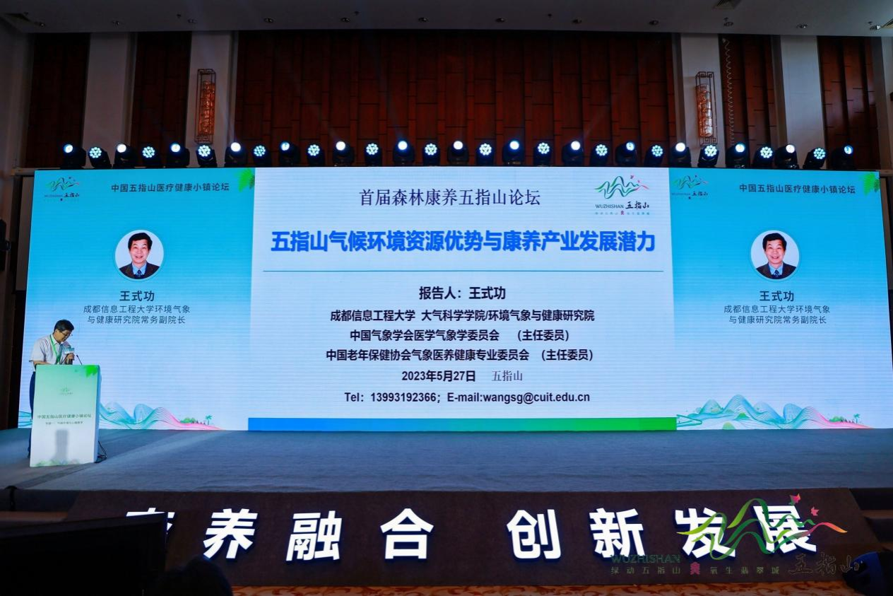 王式功教授应邀参加此次会议,并作《五指山气候环境资源优势与康养产业发展潜力》主题报告。在总结“天人合一、顺应自然”、适应气候变化养生理念的基础上,通过研究候鸟迁徙的气候养生方式,提出了新式的气候趋利候鸟式旅居康养理念;并结合气象、医学和生态学(人类气候生态位)相关理论,介绍了气候康养的科学内涵;最后基于五指山气候康养资源,分析了当地产业发展优势与潜力,得到与会领导、专家的充分肯定。