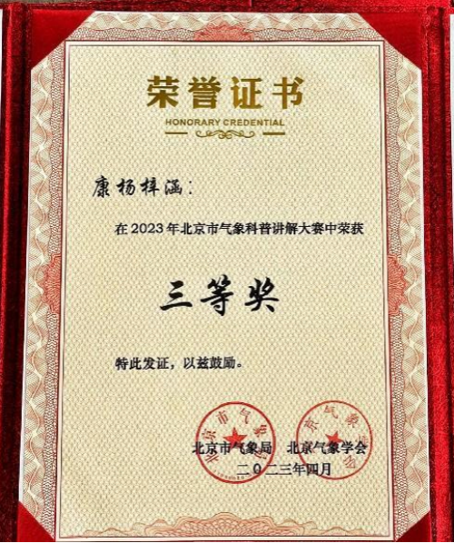 在北京气象科普讲解比赛中支持并推荐选手康杨梓涵参加比赛,同时也感谢康杨梓涵同学参加此次科普活动,期待未来有更多的同学在气象科普讲解舞台上展示自己。