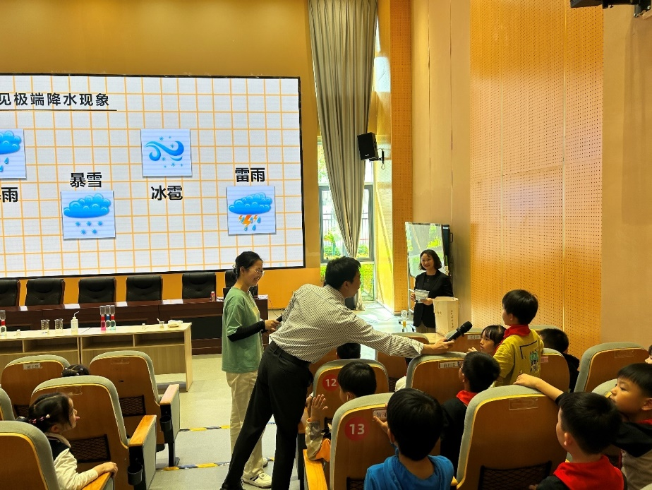 课堂上,康平博士和赵玮博士围绕什么是暴雨、暴雨是如何形成的、暴雨气象灾害的预报预警、暴雨气象灾害的危害及防护这四个主要知识点为150余名小同学做了科普讲座,通过讲解科普知识、观看科普视频、互动问答的方式,调动同学们的积极性,激发同学们学习的热情。