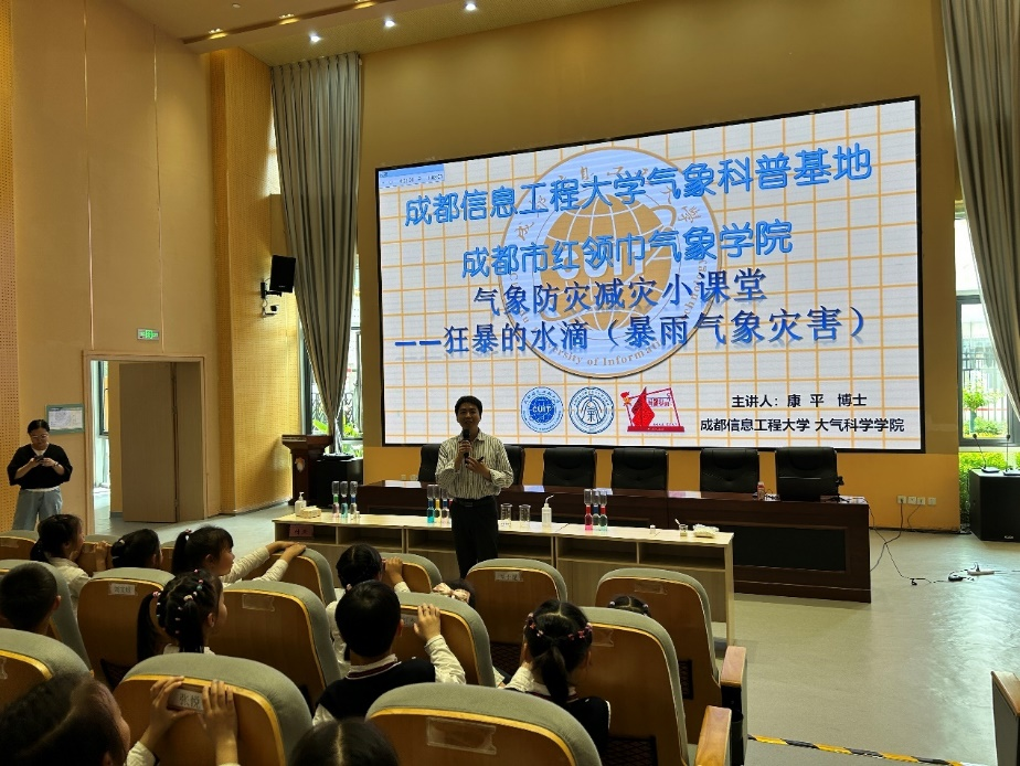的科普师生团队走进成都高新区锦晖小学金融城分校,为该校一、二年级学生开展了以“狂暴的水滴(暴雨气象灾害)”为主题的气象科普小课堂,本次活动主要通过讲解大气科学基础知识及互动科普小实验,启蒙和激发学生的科学素养,拓展科学视野,宣传气象防灾减灾知识。