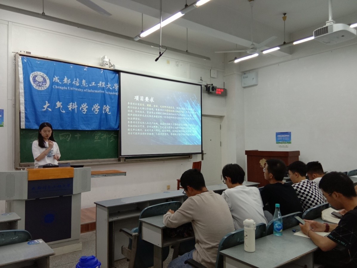 创新实践部干事闫纡含主持,本次宣讲会分为大赛简介、项目要求、参赛项目主要类型、两大赛道、赛程安排、参赛报名、大赛奖励、经验与建议八大部分,主持人重点介绍了项目要求、参赛项目类型及赛道,为同学们提供了详细清晰的赛程安排及报名方式,最后结合常见问题统一为同学们答疑解惑。宣讲过程中同学们认真聆听、学习,并在宣讲会结束后积极提出问题。