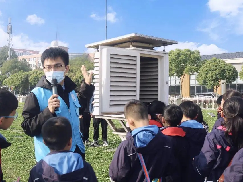 讲解员于大气探测场为少先队员们介绍了智能自动气象站、雨量计、百叶箱等仪器的使用方法和观测原理,让大家对气象要素的观测有了更直观的认识。