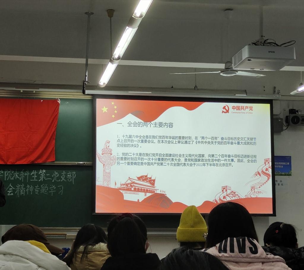 本科生第二党支部全体党员深入学习党的十九届六中全会的两个主要内容,党的十九届六中全会审议通过了《中共中央关于党的百年奋斗重大成就和历史经验的决议》,并强调“两个确立”,对新时代党和国家事业发展、对推进中华民族伟大复兴历史进程具有决定性意义,全会的另一个重要决定是中国共产党第二十次全国代表大会于2022年下半年在北京召开。随后,刘宇书记围绕党的百年历程中的两个重要决议,带领全体党员学习了《决议》的时代背景和特点,全体党员全面了解了两个历史决议产生的历史条件、时代背景、所要解决的问题以及发挥的重要作用。同时刘宇书记带领全体党员学习了对《决议》的评价和定位,《决议》深刻总结我们党一百年来团结带领人民从胜利走向胜利的伟大历程,从小到大、从弱到强的成长历程以及加强自身建设、推进自我革命的伟大实践。在会议的最后阶段,全体党员共同观看党的十九届六中全会精神专题的视频,从五个方面学习百年奋斗的历史意义,从十三个方面学习党的十八大以来取得的历史成就,发生的时代变革。