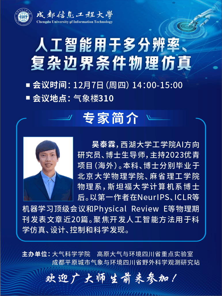 【学术讲座预告】人工智能用于多分辨率、复杂边界条件物理仿真