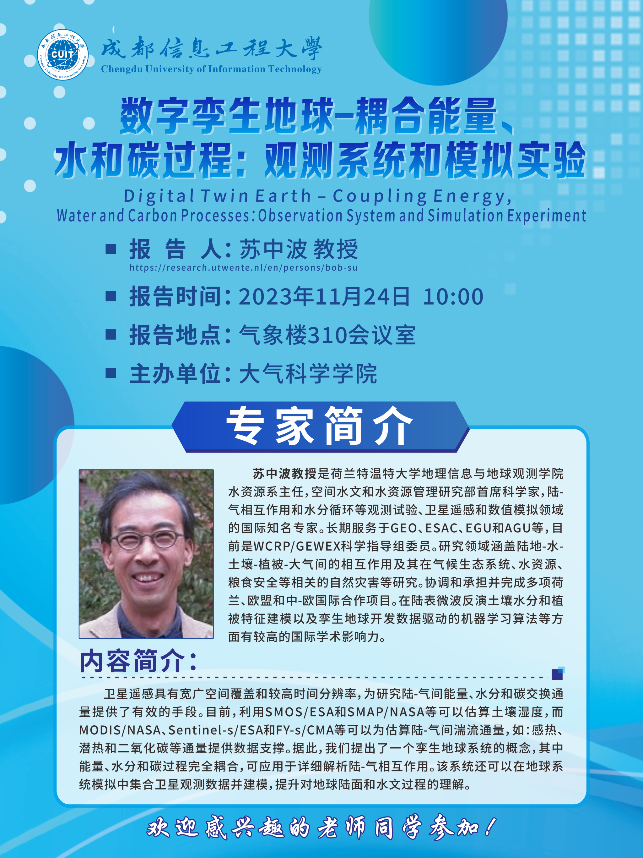 【学术讲座预告】数字孪生地球-耦合能量、水和碳过程:观测系统和模拟实验