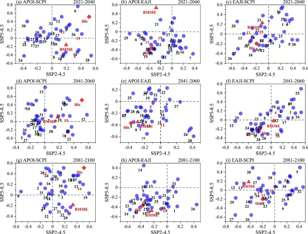 基于BMME预估了APO–降水在2021–2040年(近期)、2041–2060(中期)和2081–2100(长期)三个时段中SSP2-4.5和SSP5-8.5情景下的未来变化,结果表明,在两个SSP情景下的三个时间段内,BMME预测未来APO与EAJ之间仍呈负相关关系,而APO与降水以及EAJ与降水的关系将减弱(图3)。