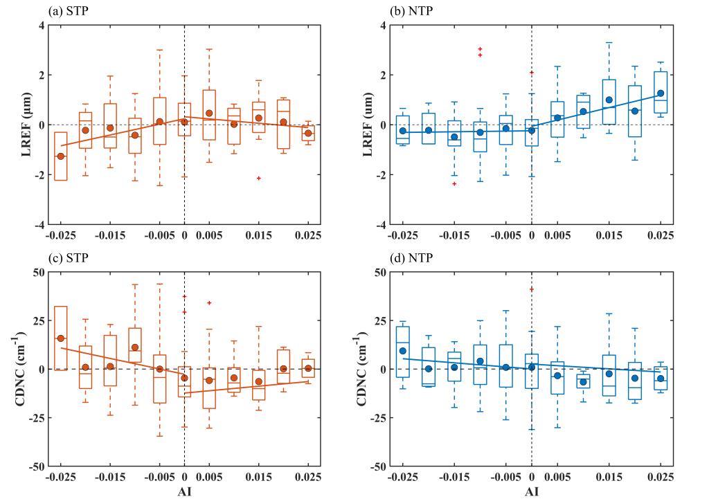 图1. 在青藏高原南部(STP)和北部(NTP),云滴有效半径(LREF)和云滴数浓度(CDNC)随气溶胶指数(AI)的变化