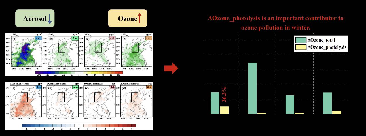 2013年开始,中国实施了严格的减排政策。经过几年的努力,目前颗粒物的浓度在逐年下降,但与此同时,臭氧的浓度则在不断攀升,特别是在京津冀地区,臭氧污染频发,甚至在冬季都会出现高浓度的臭氧污染事件。深入研究气溶胶对臭氧影响的季节差异对于我国臭氧污染的治理具有重要意义。气溶胶能够通过多种途径影响臭氧的浓度。其中,气溶胶的光学性质能够改变光解率,进而影响臭氧的光化学形成最终导致臭氧浓度的变化。本研究主要针对此影响途径进行研究。通过对我国东部地区四个季节的代表月份进行数值模拟,结果发现减排政策的实施引起颗粒物在中国东部地区的普遍降低(ΔPM2.5)且存在明显的季节性差异,其中冬季在四个季节中的减少量最为显著(左图)。通过影响光解率,ΔPM2.5引起臭氧浓度在中国东部的普遍升高(ΔOzone_photolysis),且存在于ΔPM2.5相对应的季节分布特征(左图)。对于京津冀地区,ΔOzone_photolysis在冬、秋、春、夏四季的平均增加量分别为5.5 μg m-3、2.6 μg m-3、1.2 μg m-3和1.4 μg m-3。与臭氧浓度的总变化量(ΔOzone_total)相比(右图),ΔOzone_phtotolysis在冬季对ΔOzone_total的贡献能够达到36.3%,非常显著,这表明,通过影响光解率这一影响途径,气溶胶浓度的减少对冬季京津冀地区臭氧浓度的升高尤其是高浓度臭氧事件的形成具有重要的贡献。