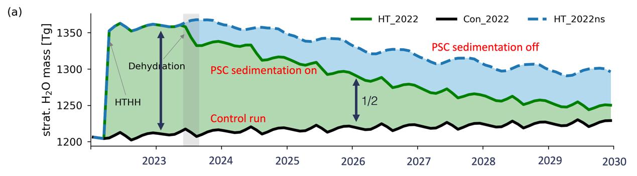2022年1月15日汤加海底火山喷发,携带大量的海水进入平流层,是过去30年有仪器记录的地球大气层内发生的最剧烈的火山喷发事件(火山爆发指数VEI达到5.7级)。值得注意的是,本次火山柱虽然释放了少量的SO2(~0.5 Tg),但向平流层注入了大量水汽(~150Tg/1.5亿吨),引起了前所未有的气候变化。水汽作为温室气体,很可能使全球地表升温,加剧地球暖化速率。其中,广受关注的问题是,汤加火山喷发的水汽及其引起的大气平流层臭氧损耗会持续多久?