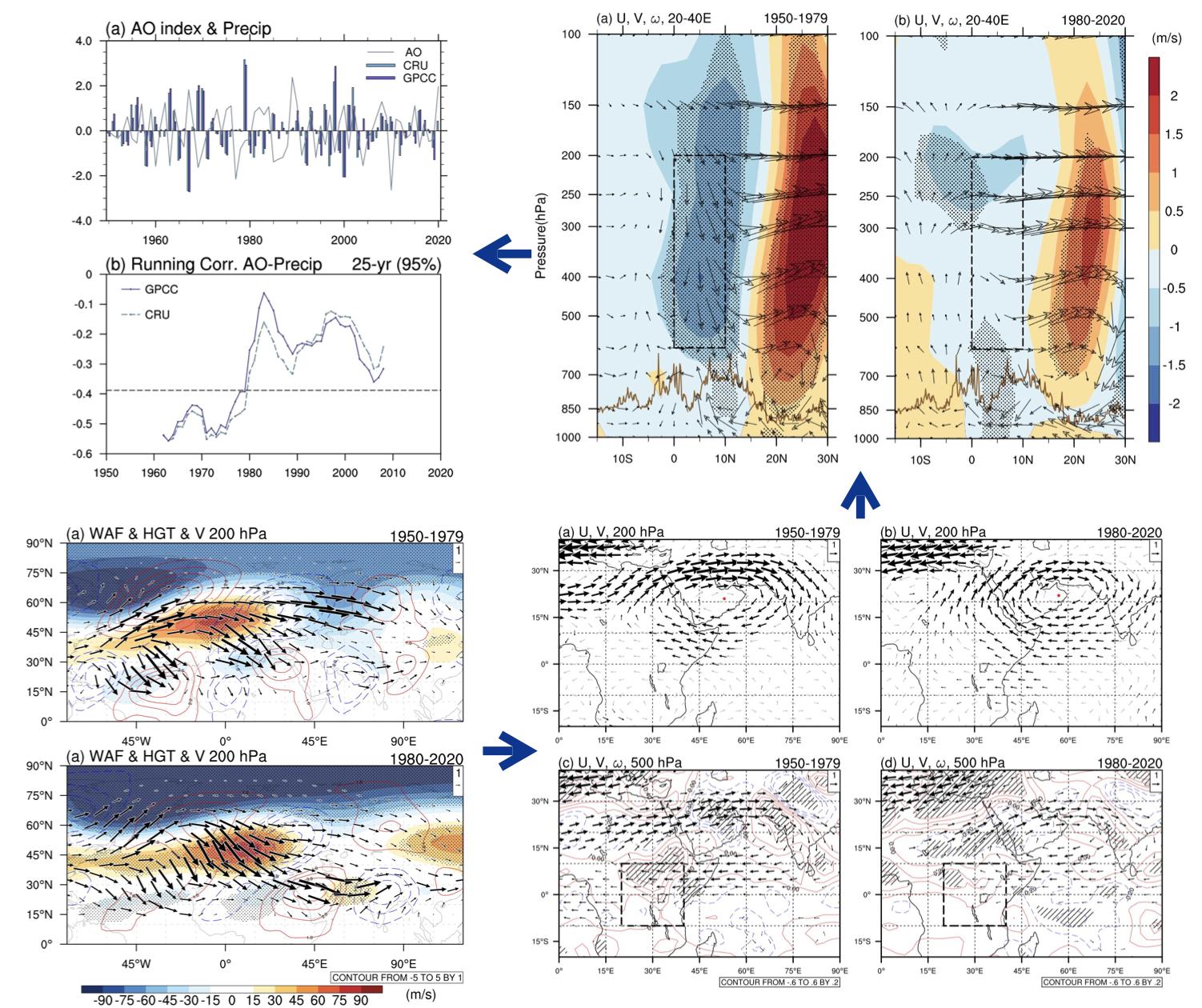 本研究分析了冬季北极涛动与同时期东非降水关系的变化。研究结果显示,北极涛动与降水的关联性并非恒定。在1950至1979年间,AO与东非降水显著负相关,但之后这种相关性逐渐减弱。随着时间推移,与AO相关的阿拉伯反气旋环流同样经历了变化。在早期,阿拉伯半岛上空的反气旋向西扩展,引发东非显著的下沉气流,从而导致低层水分减少和降水量下降。然而,在后期,这种异常下沉气流在东非明显减弱,降水变化也不再显著。这些变化很可能由AO相关的波动活动差异所引起,早期波动活动沿高纬度路径从地中海向东至俄罗斯传播,而后期则更倾向于从地中海向东南方向至沙特阿拉伯传播,使得Rossby波活动比早期更向东扩展。