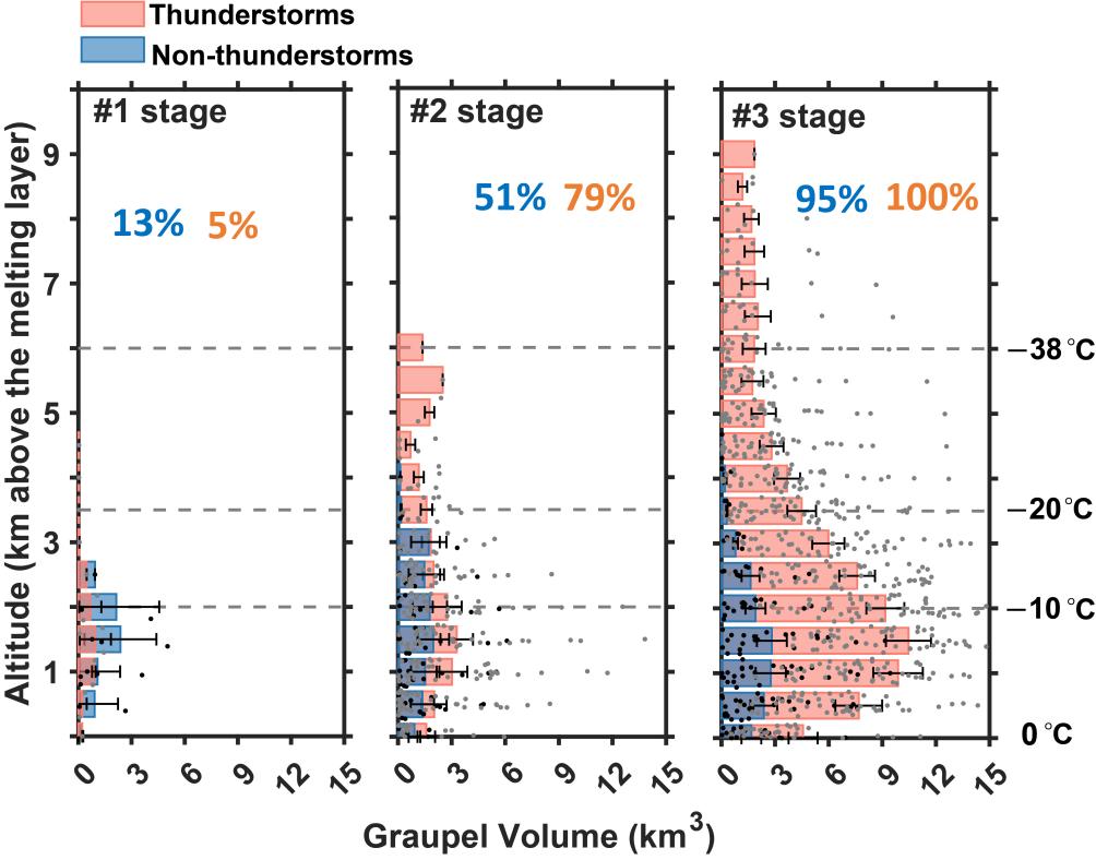 图3.孤立雷暴单体初期至闪电起始生命期内融化层上方霰体积垂直分布(橙色条形图,取样本平均值)与孤立非雷暴单体初期至最强回波生命期内融化层上方霰体积垂直分布(蓝色条形图,取样本平均值)对比,数值文本对应被统计样本(存在霰粒子)占总样本的比例,散点表示单个样本在每层高度上(0.5km至20 km高度,每500 m为一个高度层结)总的霰体积(灰色对应雷暴云,黑色对应非雷暴云)