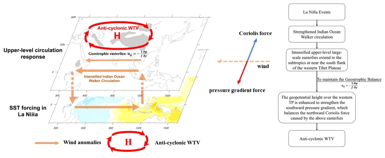 2021级硕士生蒋阳杰在客座中山大学期间,与中山大学和英国纽卡斯尔大学研究人员合作,于国际知名期刊《Journal of Climate》(IF:4.0,JCR一区)在线发表了研究论文《Impacts of ENSO on Atmospheric Circulation over the Western Tibetan Plateau in Autumn》。该研究在观测资料中发现,ENSO与WTV在秋季的联系最为显著,La Niña(El Niño)事件对应着反气旋型(气旋型)WTV,此外,秋季耦合的程度随ENSO强度增强而增强。海温强迫试验验证了秋季ENSO对WTV的这种影响,尽管在强迫试验中引起的异常响应强度略弱,进一步的数值模拟试验发现热带西太平洋是ENSO对青藏高原大气环流产生影响的关键区域。该研究提出一种可能的机制:在拉尼娜(厄尔尼诺)事件期间,增强(减弱)的印度洋沃克环流导致热带印度洋上空对流层上部出现显著的东风(西风)异常。这些异常风场能够延伸至青藏高原南缘附近的亚热带区域。为维持准地转平衡,青藏高原的位势高度增加(减少),导致青藏高原出现反气旋性(气旋性)异常。而ENSO更强则会导致青藏高原南缘附近出现更强的纬向风异常,进而引发更强的WTV。这些结果有助于理解热带与青藏高原气候之间的耦合过程,同时对理解青藏高原气候的主导因素具有重要意义。