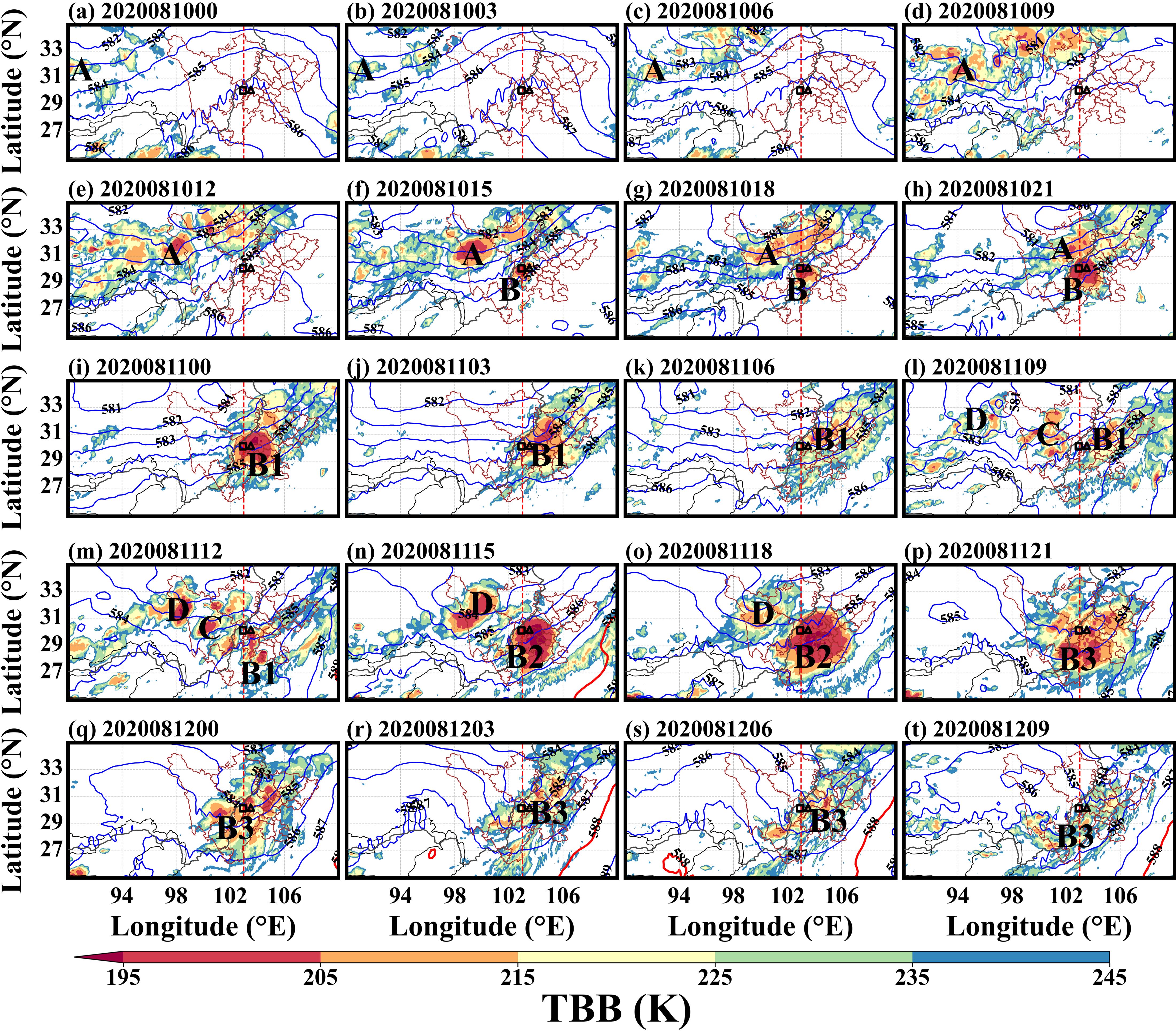图1.2020年8月10日00:00至8月12日21:00的逐3小时TBB分布(单位:K)。彩色为TBB;蓝色等值线为500 hPa位势高度场(单位:dagpm);灰色实线为青藏高原(TP)边界,红色虚线为TP平均东界(103°E);棕色实线为四川省及其市级行政区边界。方形与三角形分别表示芦山站与蒲江站。A、B、C、D、B1、B2、B3分别标示主要的MCS云团。(Jiang et al., 2026)