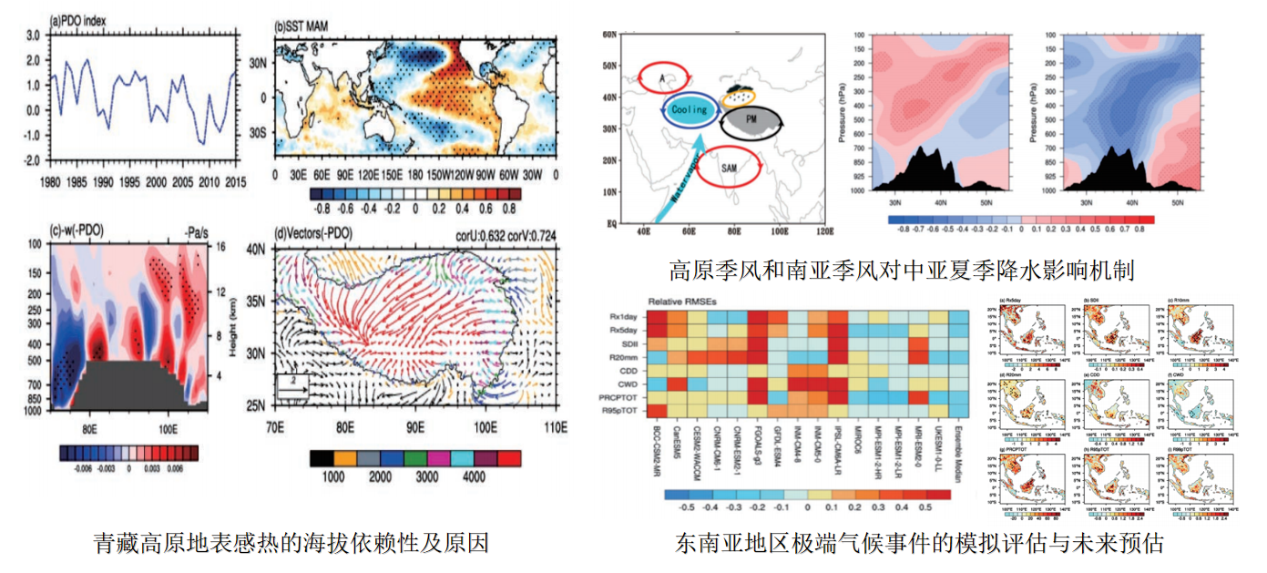 3.科研成果 KS体育 在国家重点研发计划项目、国家自然科学基金重大研究计划项目、国家自然科学基金重点项目等一系列国家级和省部级高层次科研项目的支持下,长期围绕气候与气候变化、高原气象、大气物理与大气环境和气象防灾减灾等方向开展特色研究,年均发表高水平论文200篇以上,科研经费年均到账2300万元,近五年获得省部级科技进步奖7项。 气候与气候变化方面,关注服务“一带一路”的青藏高原及其周边地区天气-气候变化研究。青藏高原地表风速和地气温差是影响高原地表感热随海拔变化的主要因素。高原高海拔地区日照时数和积雪深度可引起地气温差的变化,进而导致地表感热随海拔高度的改变。当高原季风偏强和南亚季风偏弱时,对应中亚对流层中高层气温偏低,中亚上空受异常气旋控制,导致更多的夏季降水发生。东南亚地区极端气候事件的强度和频率在2°C增暖阈值下要明显高于1.5°C,局地性的极端降水事件在高排放情景下的发生时期会更加集中。